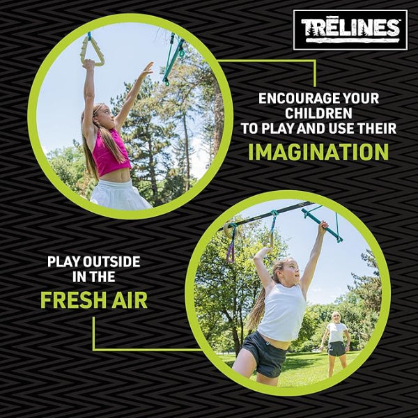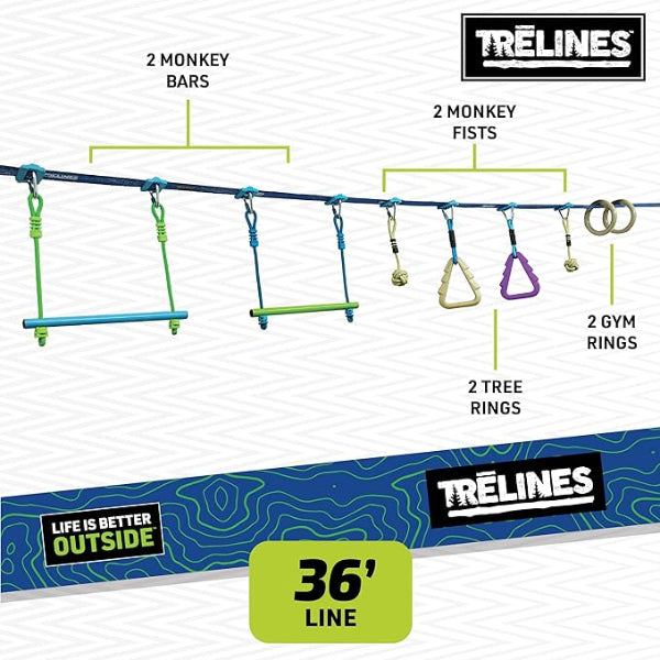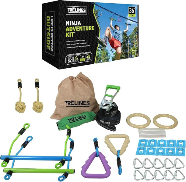 PLAY LIKE a NINJA! The new Trelines Ninja Adventure Line is a super popular item for shorter Ninja course 30'(10M) or less. Kit contains: 36 Line and Ratchet, 2 Monkey Bars, 2 new Tree Gym Rings, 2 Monkey Fists and 2 Multi Purpose Gym Rings, Ratchet Cover and Storage Bag, and 10 Treline Clips and Delta Carabiners.