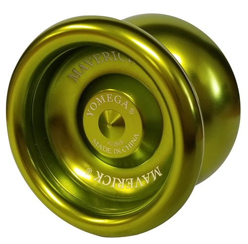 The Yomega Maverick is an aluminum metal responsive ball bearing Yo-Yo, featuring a wing shaped body design, a weighted perimeter, and a standardized C size ball bearing with internal silicone response pads.