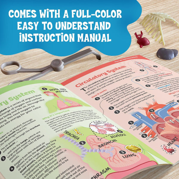Use the toy forceps to carefully remove the squishy organs, muscles, and bones from the clear body shell, learning the location and function of each one step by step. Then, put them all back together again and display your visible human body on the included stand.