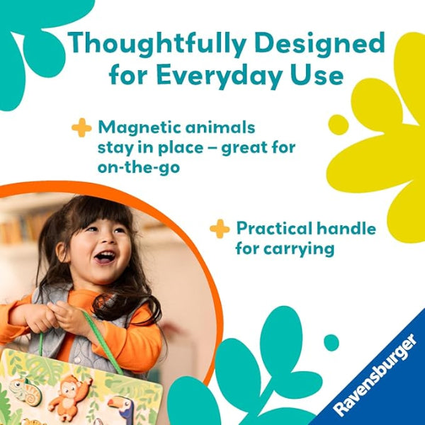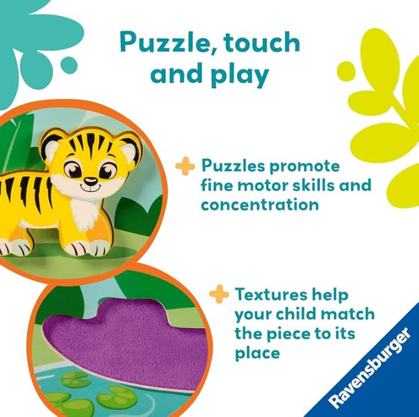 Explore textures and develop problem-solving skills with the Ravensburger Play+ Wooden Touch & Play Puzzle – In the Jungle. Featuring chunky, easy-to-grasp wooden animal pieces, this puzzle encourages fine motor skills and shape recognition. Each piece reveals a fun texture underneath, providing an additional sensory experience. Made from FSC-certified wood, this durable puzzle is designed for children and supports hands-on learning.