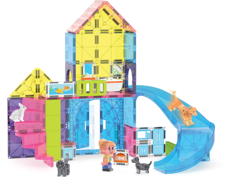 Step into a world where pets are here to play and creativity knows no bounds. With the MAGNA-TILES® Pet Playhouse, kids can build the ultimate pet paradise for a playful puppy, a curious cat, a bouncy bunny, and their adventurous dog friend. Open the Double Door to a playhouse where your pets climb furniture, glide down the new Slide piece, and explore a space filled with endless imaginative possibilities.
