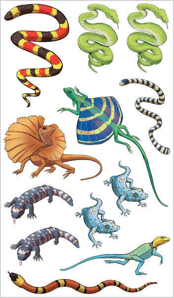 Snakes and reptiles are a fascinating favorite of animal lovers of all ages. These cool and creepy creatures slither, swim, stalk, and crawl across every page of Slithering, Scaly Tattoo Snakes & Reptiles. From the venomous Viper and Gila Monster to the nocturnal Gecko and camouflaging Chameleon, reptile-crazy kids will love to wear temporary art of their favorite species! 50 colorfully illustrated temporary tattoos are scientifically accurate and easy to apply with just a little water. Each featured species is accompanied by fun and fascinating facts. Did you know that the Texas Horned Lizard can startle predators by squirting blood from their eyes at a distance of up to five feet? Or that the Collared Lizard can run using only its back legs? Kids will love quizzing their friends on newly learned animal trivia while showing off their interesting ink.