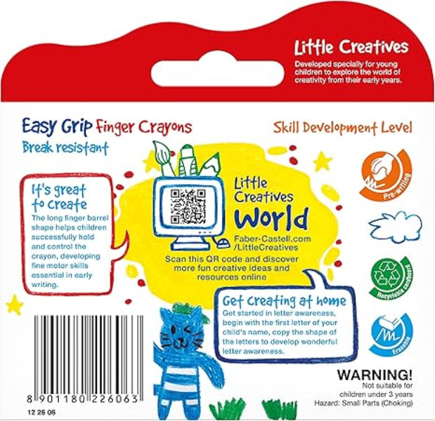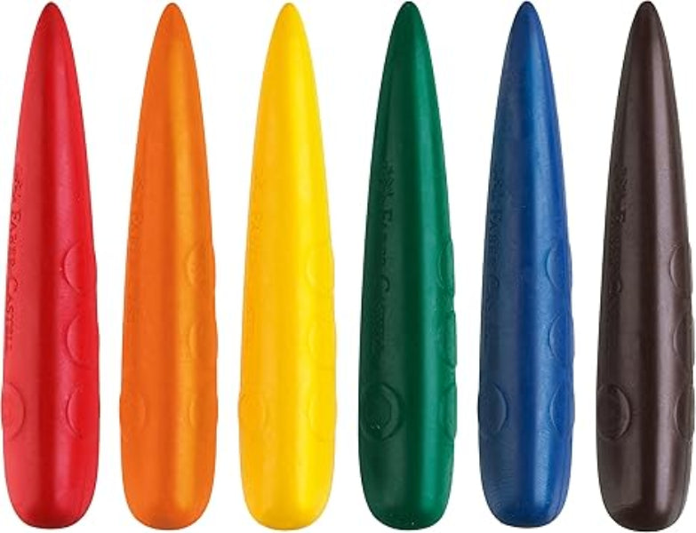Faber Castell Early Age Easy Grip 6 Colors Wax Crayons ideal for mixed techniques, shading, coloring. The bright colors can be easily rubbed out with the eraser and little hands stay clean. High pigment colors with soft, velvety texture is easy to apply. Ergonomic finger shape makes the crayons ideal for children age 3 and above. They encourage the transition from a fist grip to a four-finger grip.