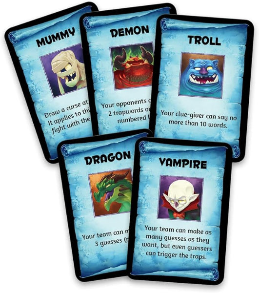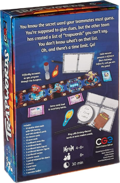 Trapwords is a fun and fast-paced party game for two teams, who simultaneously prepare their lists of trapwords. The simple task of giving clues for your word is made fiendishly difficult by not knowing which words you can't say. If you succeed, you advance to higher levels with more trapwords and additional challenges. Includes a set of regular words as well as a set with a fantasy theme.