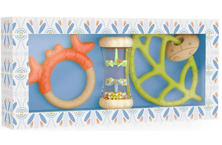 This boxed gift set includes 1 small rain stick and two natural wood and silicone teethers.