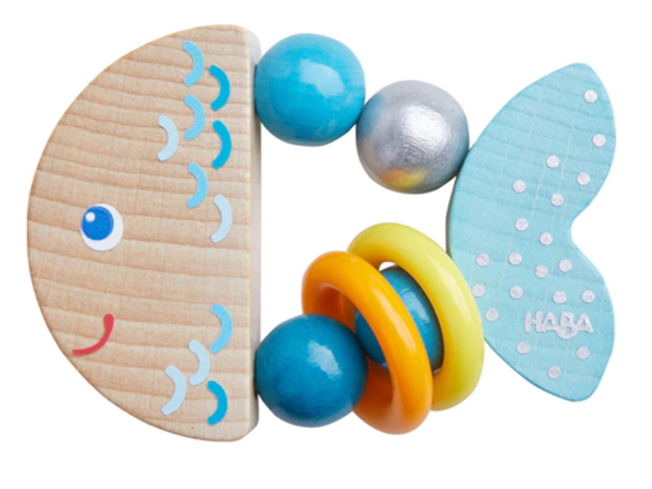 Hey there, what's this beautiful sea creature we have caught here? This wooden clutching toy will delight babies with the rattling sounds it makes.