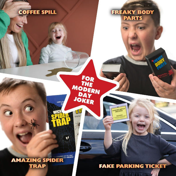 If you are a young comedian that wants to make your friends and family laugh this is the ideal set for you! Including 100 jokes and pranks designed for pranksters aged 8 years and older. The set includes The original selfie phone squirter, jumping spider eggs, augmented reality spider tricks, fake parking ticket, bone cruncher and freaky body surprises. This prank kit will have everyone in stitches!
