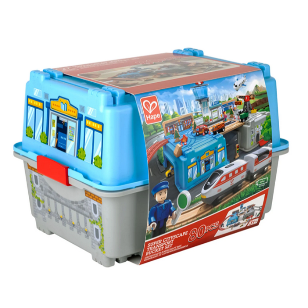 The practical bucket holds all 80 pieces for storage and carrying, which also actually forms part of an imaginary city as four removable wooden panels with lifelike graphics can be placed in the layout. Kids will spend hours building bridges and a full transport system, helping them learn to organize and practice language, social, oral and creative skills.